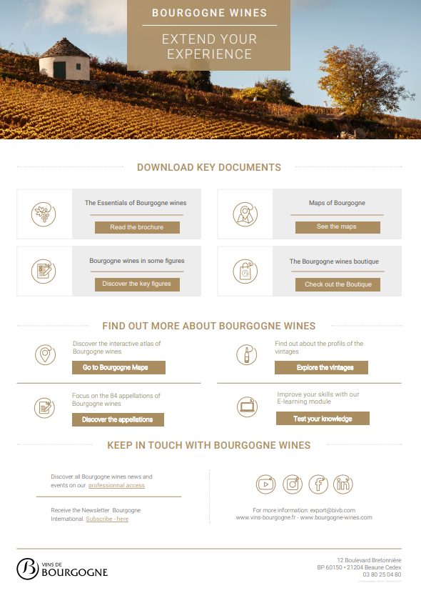 The Bourgogne Wine Board has designed a digital folder for you to download , so you can easily access key information and documents relating to Bourgogne wines.